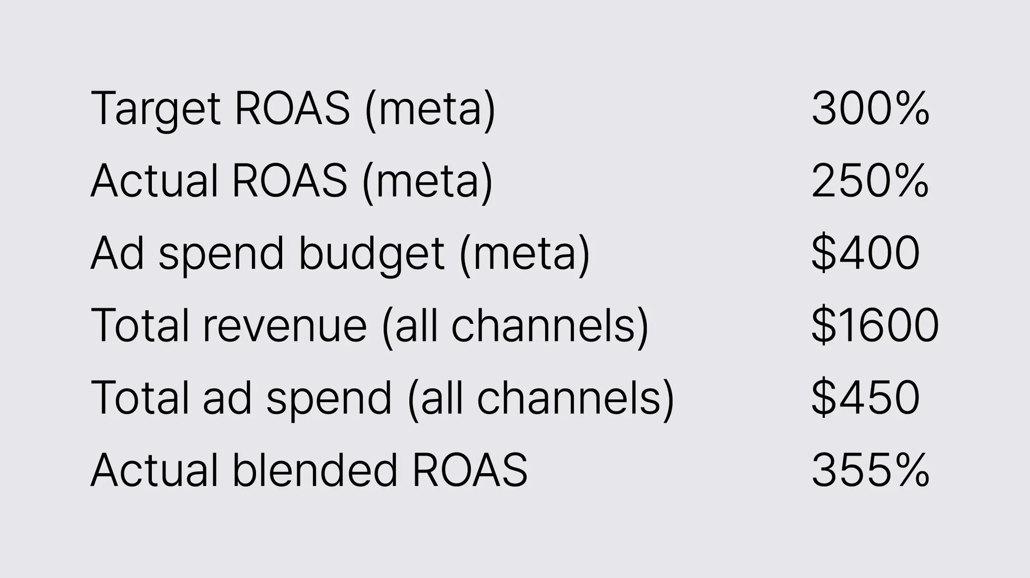 If you only consider the ROAS at meta, it decreases to 250%, but the total revenue tells a different story. In terms of gross profit, it's a positive result. We can expect that various traffic not accounted for by meta has led to an increase in profit. From the blended ROAS perspective, you are earning more profit with increased ad spend, so you might want to allocate more resources to meta. However, if the marketer does not give this much thought, they might simply reduce the budget.